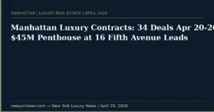 Manhattan logged 34 luxury contracts for April 20-26, led by a $45 million penthouse at 16 Fifth Avenue in Greenwich Village from Madison Realty Capital’s RAMSA-designed boutique tower, per Olshan Realty.